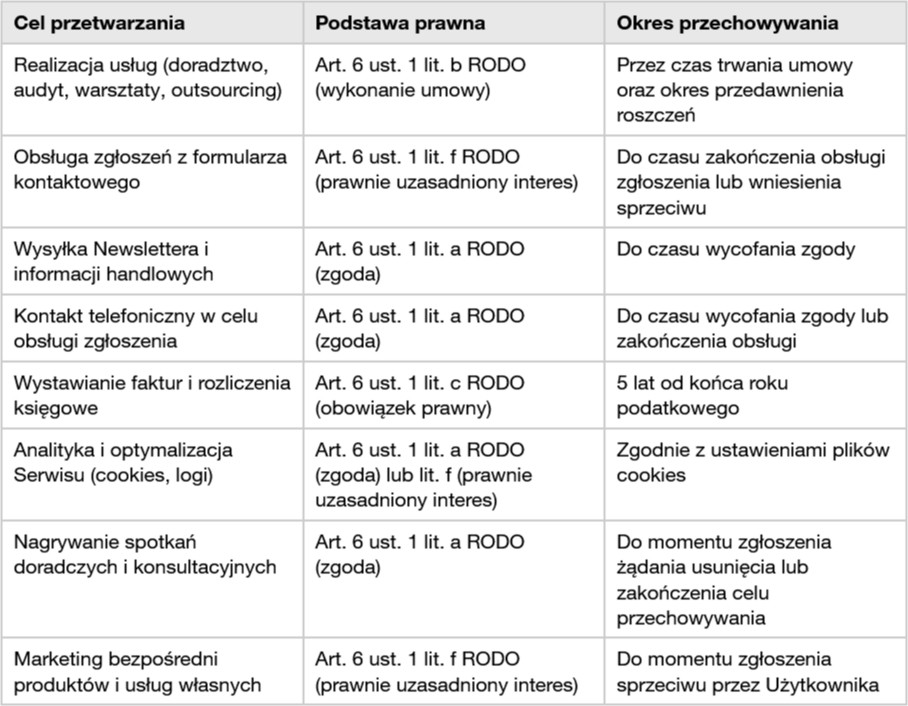 Podanie danych osobowych jest dobrowolne, lecz niezbędne do skorzystania z Usług opisanych w Regulaminie Serwisu, wypełnienia formularza kontaktowego lub zapisu do Newslettera.
